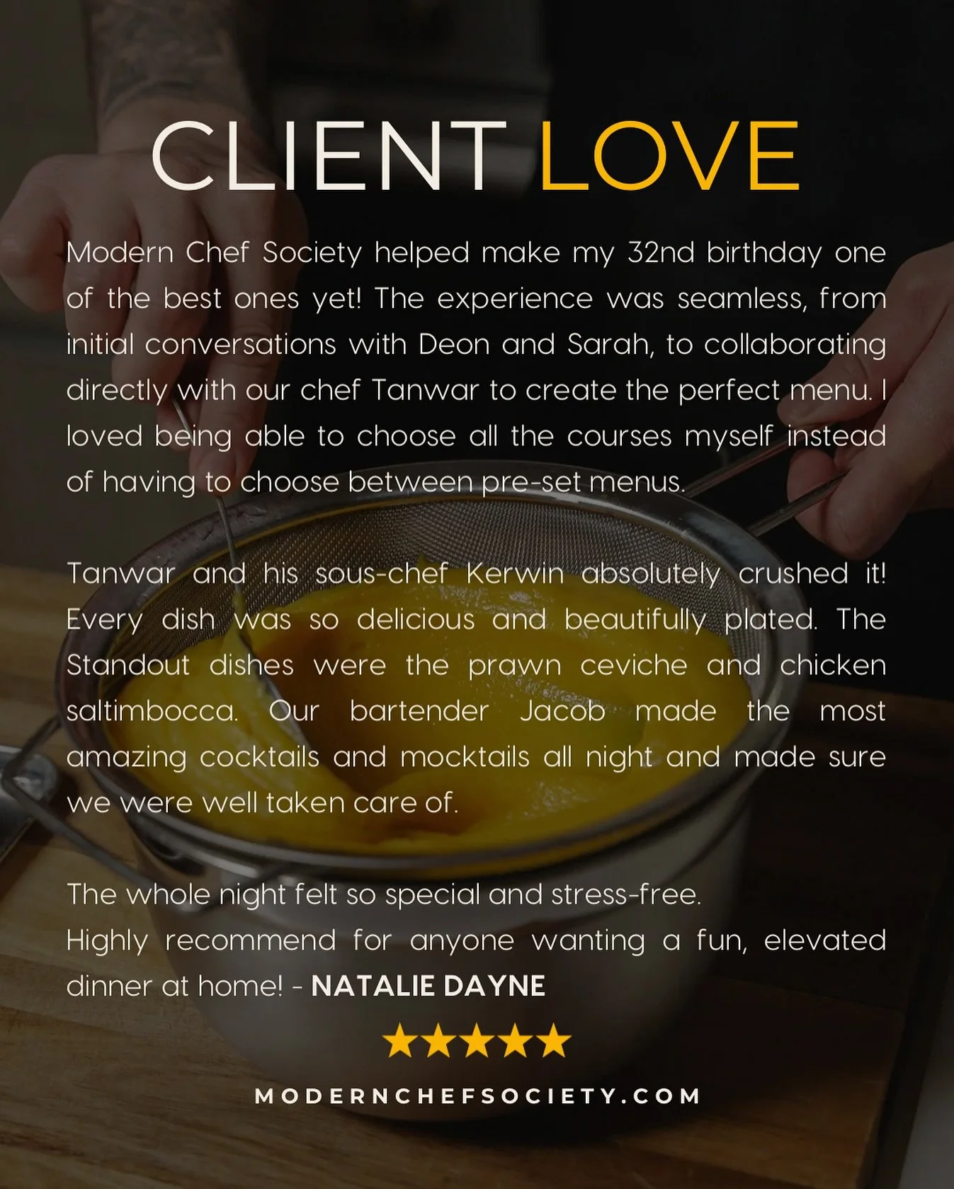 An elegant 5 course meal, perfect for intimate gatherings or larger celebrations.